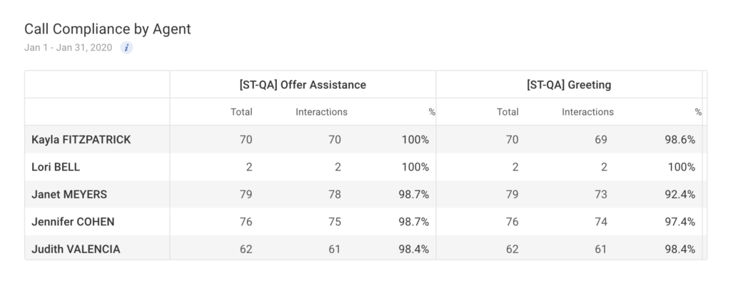 In addition to our AIS and TEI scores, we have a host of individual QA categories that can be added to any dashboard. These include categories like “agent asks for account number”, “offer assistance”, “issue resolution”, and so many more. By going beyond scores, we make it possible for the individual user to dive deeper into each call. (Plus, those dashboards are customizable, so you can visualize that data however it’s easiest to read.)